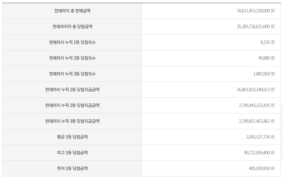 1등 최고금액과 최저 금액 당첨금 차이가 100배나 되네요. 평균 당첨 금액 20억 가량 됩니다.